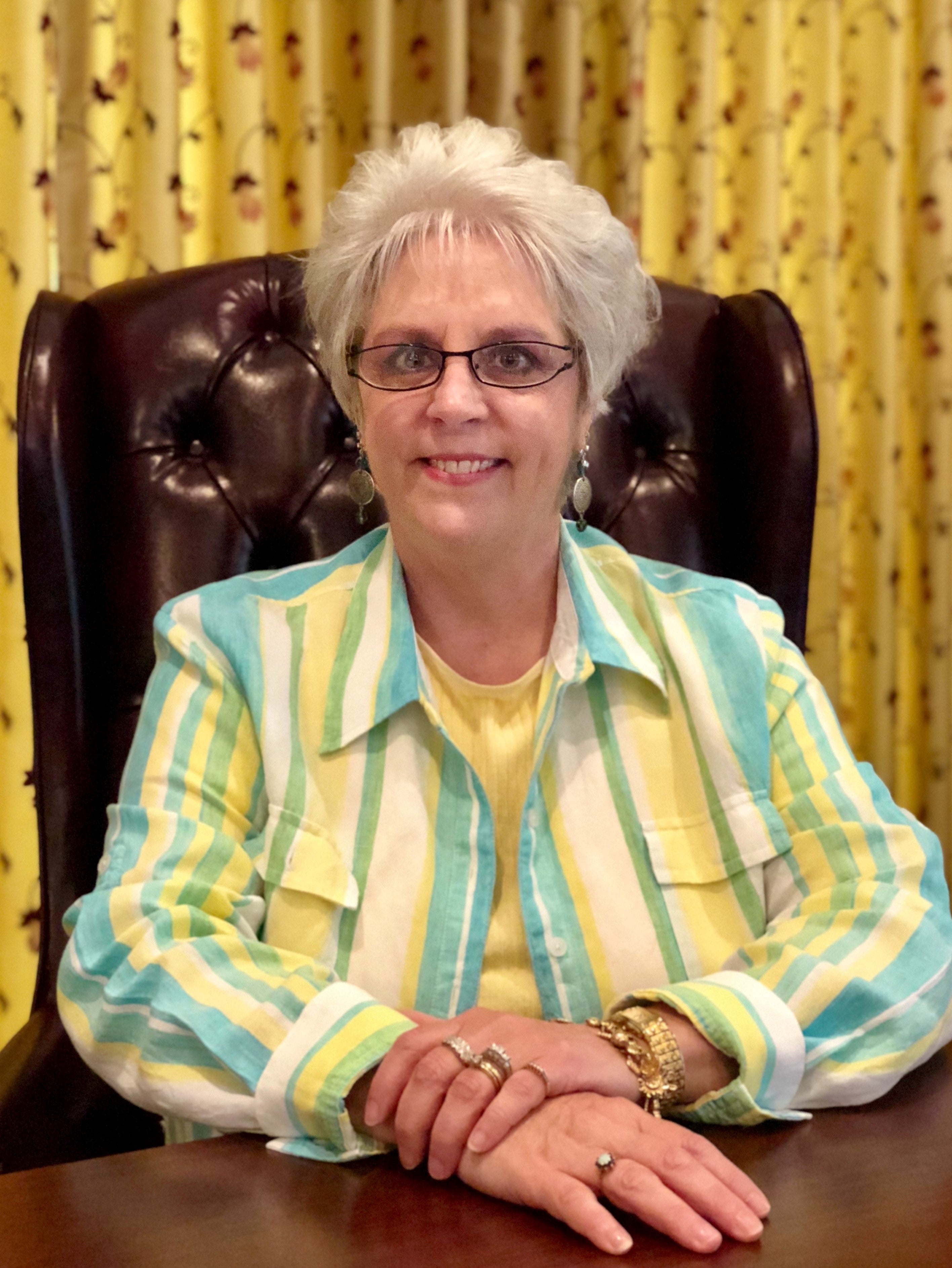 Lisa setting in chair with hands on table.